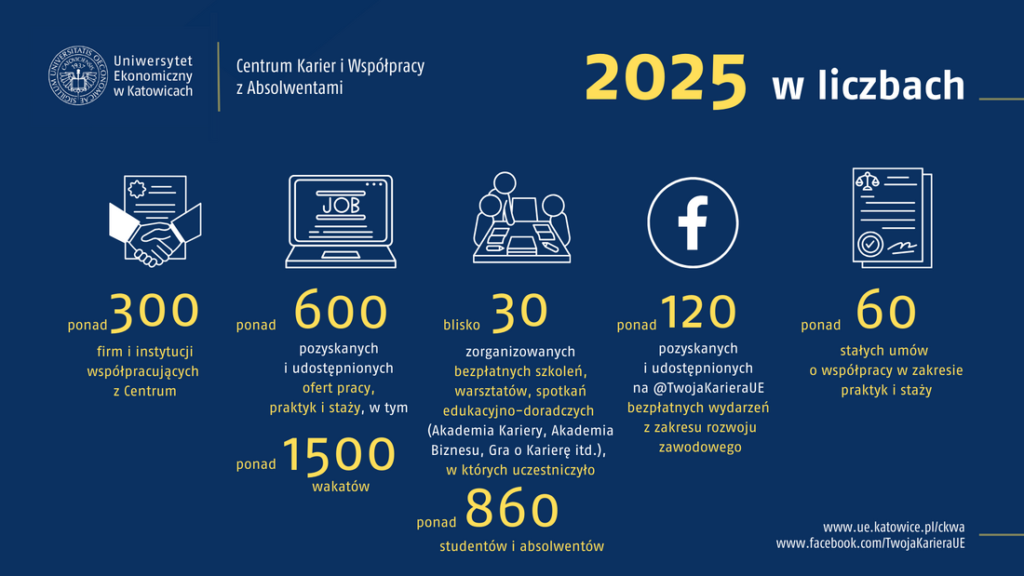 Centrum Karier i Współpracy z Absolwentami Uniwersytetu Ekonomicznego w Katowicach podsumowało intensywny rok 2025. Dzięki współpracy z ponad 300 firmami i instytucjami udało się zorganizować dziesiątki bezpłatnych szkoleń i warsztatów. W samych wydarzeniach wzięło udział ponad 860 studentów i absolwentów.