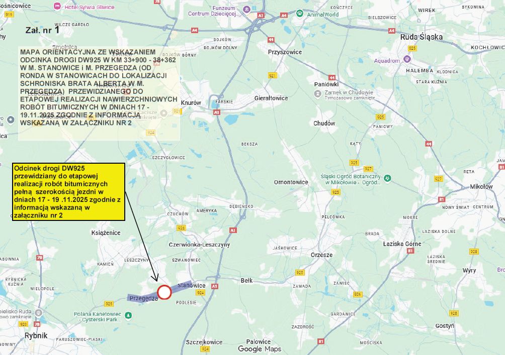 | 33+900 – 35+000 | Stanowice (od ronda na skrzyż. DW925 i DW924 do lokalizacji AUTO SALON) | 19 listopada | 7.00 – 17.00 |