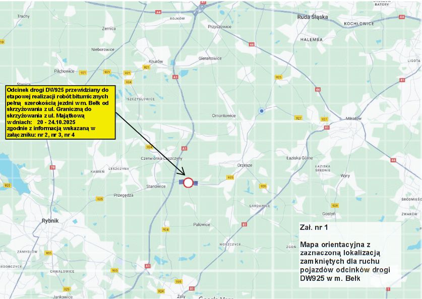 Firma Strabag Infrastruktura Południe Sp. z o.o. poinformowała o czasowym zamknięciu drogi wojewódzkiej nr DW925 w m. Bełk z powodu robót bitumicznych prowadzonych z wykorzystaniem pełnej szerokości jezdni. Zmiany dotyczą kilku wyodrębnionych odcinków i zostały podane z konkretnymi terminami i godzinami prac.
