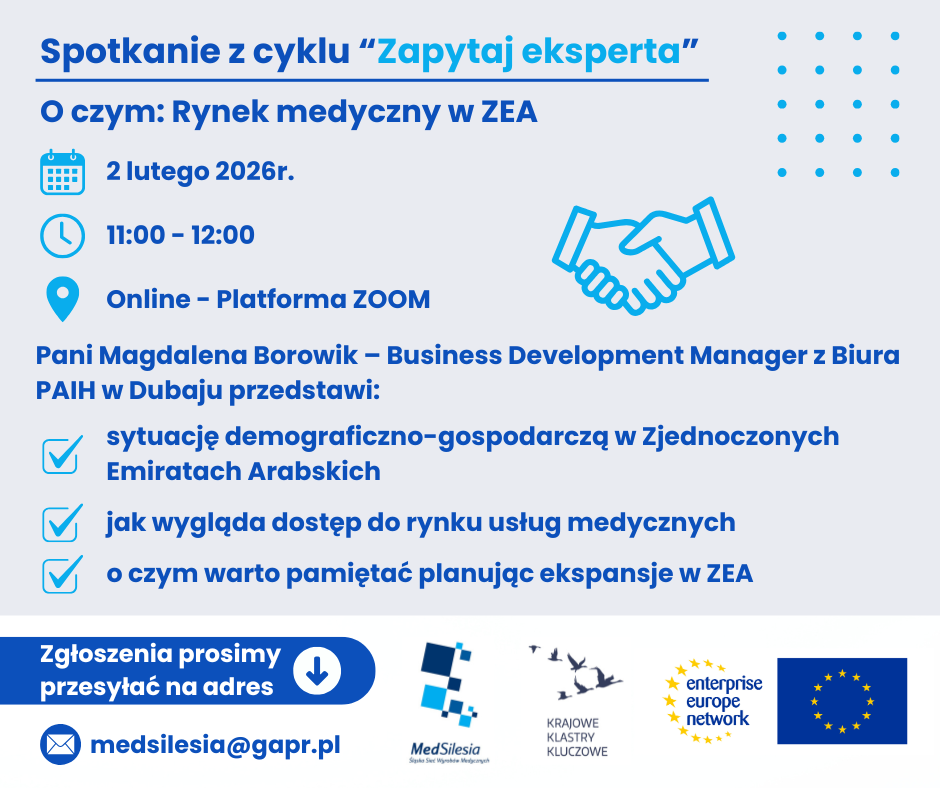 Klaster MedSilesia organizuje kolejne spotkanie eksperckie, podczas którego przedstawione zostaną możliwości rozwoju biznesu medycznego na rynku Zjednoczonych Emiratów Arabskich. Webinar odbędzie się 2 lutego 2026 roku.