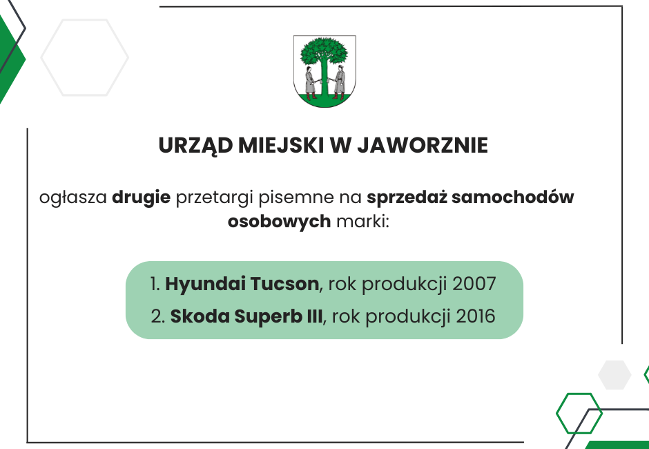 Urząd Miejski w Jaworznie ogłasza drugi pisemny przetarg na sprzedaż dwóch samochodów osobowych będących własnością Gminy Miasta Jaworzna. Termin składania ofert upływa 28 sierpnia 2025 r. o godz. 9:00.