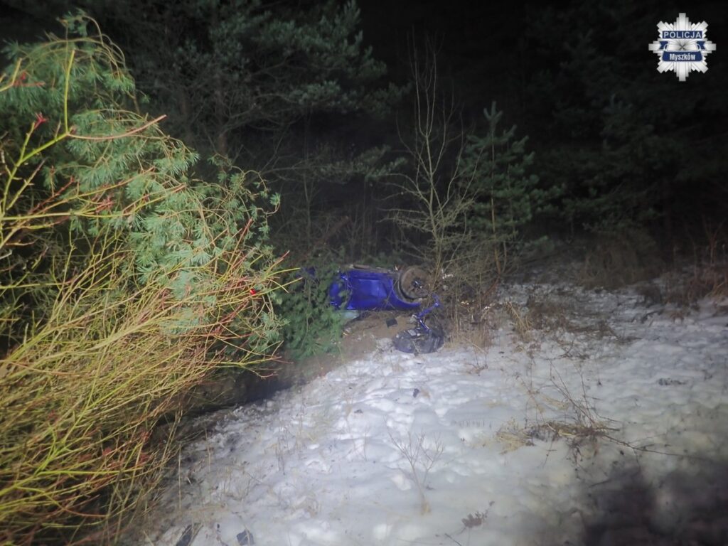 Wypadek miał miejsce wczoraj około godziny 21:45. Ze wstępnych ustaleń myszkowskich policjantów wynika, że 40-letni kierowca nie dostosował prędkości do panujących warunków drogowych. Na łuku drogi stracił panowanie nad pojazdem, w wyniku czego doszło do dachowania samochodu.