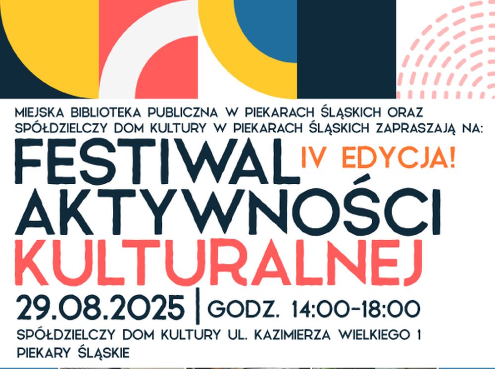 Miejska Biblioteka Publiczna im. Teodora Heneczka w Piekarach Śląskich wraz ze Spółdzielczym Domem Kultury zapraszają na IV edycję Festiwalu Aktywności Kulturalnej, która odbędzie się przy ul. Kazimierza Wielkiego 1. Wydarzenie ma charakter otwarty — przewidziano warsztaty, animacje, spotkania z lokalnymi autorami oraz stoiska rękodzielników; wstęp jest wolny.