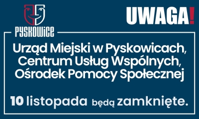 - Urząd Miejski w Pyskowicach będzie nieczynny 10 listopada br.
