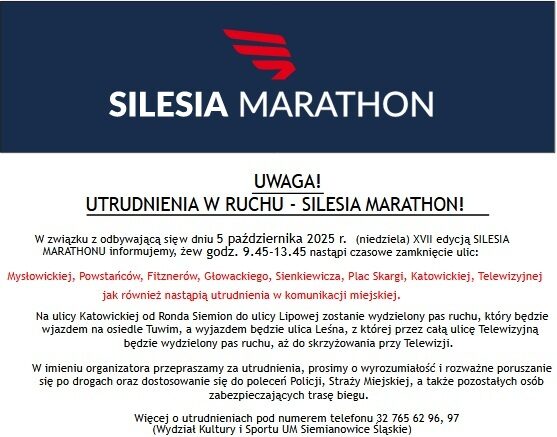 W związku z odbywającą się 5 października 2025 r. (niedzielę) XVII edycją SILESIA MARATHONU w godzinach 9.45 – 13.45 wystąpią czasowe utrudnienia w ruchu na terenie Siemianowic Śląskich. Zamknięte będą wybrane ulice, a także przewidywane są przerwy i zmiany w komunikacji miejskiej.