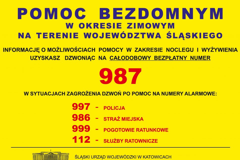Od 1 listopada do 31 marca funkcjonuje specjalna całodobowa infolinia obejmująca teren całego województwa śląskiego. Pod numerem telefonu 987 można uzyskać informację o możliwości pomocy dla osób bezdomnych.