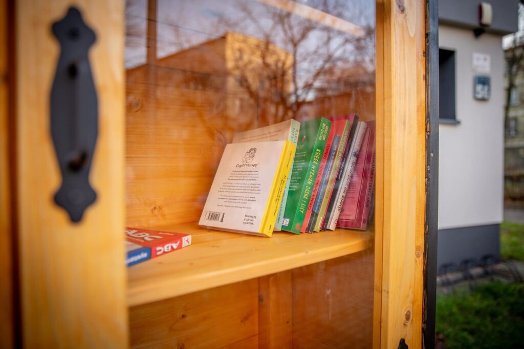 Mała, zewnętrzna szafka została ustawiona przy wejściu do placówki przy ul. Elfów 56. Jest dostępna codziennie — wystarczy otworzyć drzwiczki i wybrać książkę. Proste. Szybkie. Dla każdego.