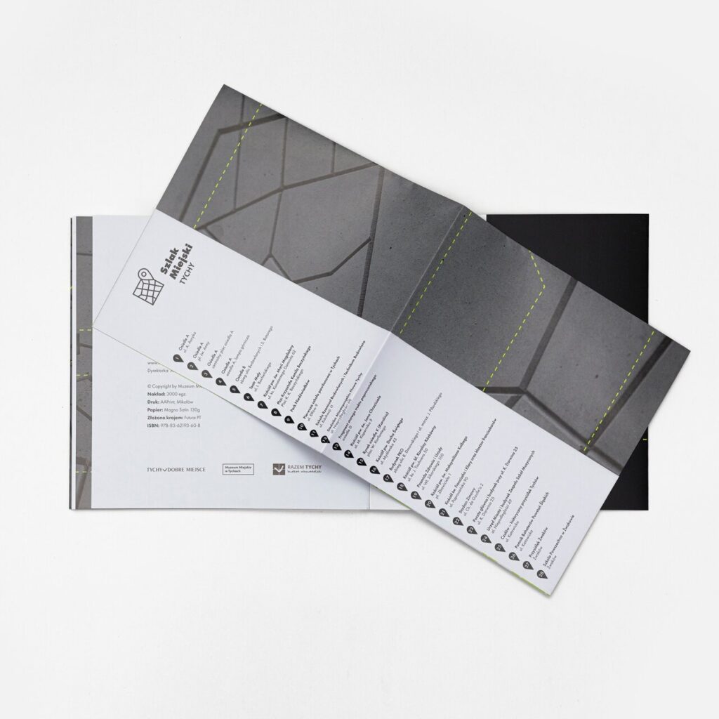 Odświeżona w 2021 roku identyfikacja graficzna Szlaku Miejskiego Tychy znalazła swoje odzwierciedlenie w szacie graficznej przewodnika. Na tylnej okładce publikacji umieszczono rozkładaną mapę z lokalizacjami opisywanych obiektów, oznaczonymi w formie czytelnych pinezek. Za projekt graficzny i skład odpowiada Marcin Kasperek z KLAR Studio.