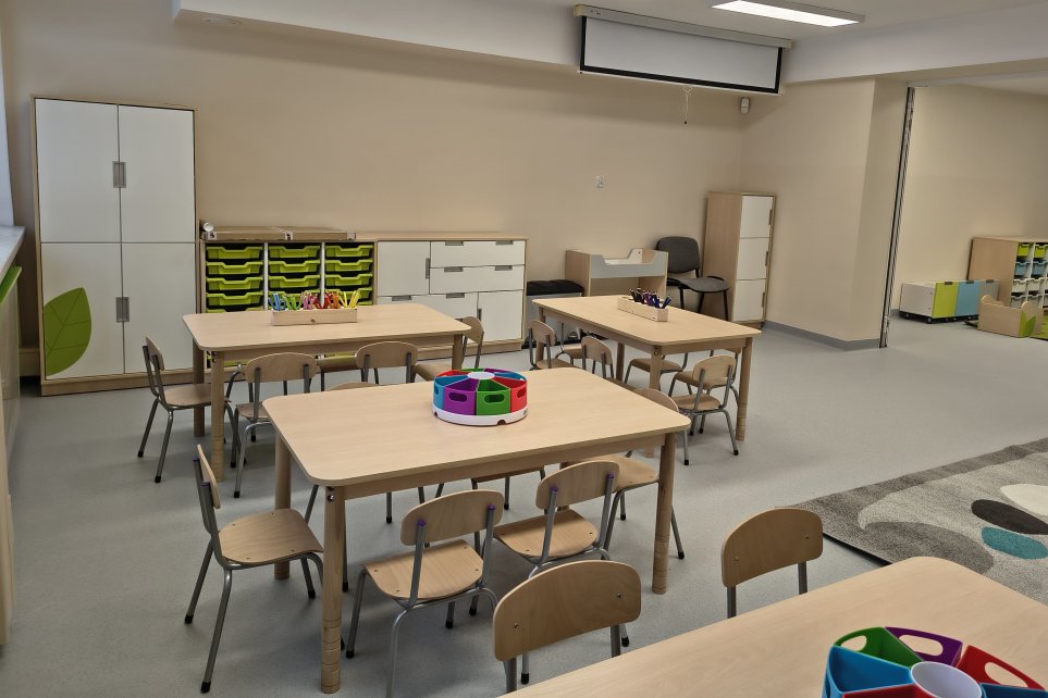 W ramach realizacji zadania powstała sala pobytu dzieci z możliwością podziału na dwie części przy wykorzystaniu mobilnej ścianki. To rozwiązanie zapewnia elastyczność w prowadzeniu zajęć, pozwalając na dostosowanie przestrzeni do aktualnych potrzeb edukacyjnych i zabawowych.