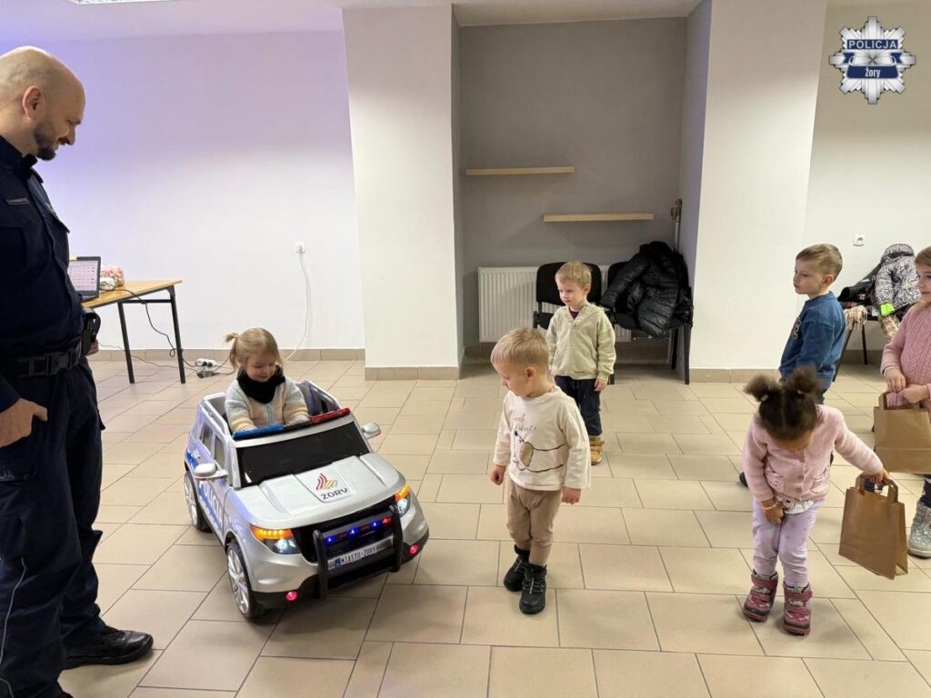 Z małymi gośćmi spotkali się osobiście Komendant Miejski Policji w Żorach podinspektor Marek Ryszka oraz jego I Zastępca - młodszy inspektor Marek Dryka. Funkcjonariusze opowiadali dzieciom o służbie w Policji i podkreślali, jak ważne jest dbanie o bezpieczeństwo własne i innych.