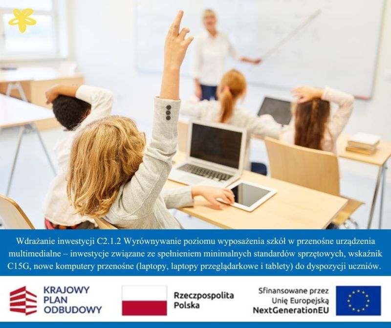 Inwestycja wpisuje się w projekt C2.1.2 Wyrównywanie poziomu wyposażenia szkół w przenośne urządzenia multimedialne, realizowany w ramach wskaźnika C15G. Jej celem jest poprawa jakości edukacji poprzez wyposażenie szkół w nowoczesne narzędzia oraz wyrównywanie szans edukacyjnych przez zmniejszenie różnic w dostępie do technologii. Program finansowany jest z Krajowego Planu Odbudowy i Zwiększania Odporności; Polska otrzymała na ten cel dofinansowanie w wysokości 1.410.000.000,00 PLN. Więcej informacji o programie można znaleźć na stronie Krajowego Planu Odbudowy i Zwiększania Odporności.